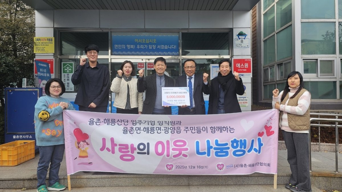 율촌·해룡 산단협의회, 율촌면에 사랑의 500만 원 기탁 (여수시 제공) [PEDIEN] 율촌·해룡산단협의회가 율촌면의 취약계층 주민들을 위한 따뜻한 나눔을 실천했다.협의회는 지난 16일, 율촌면사무소에 사랑의 성금 500만원을 전달하며 지역사회와의 상생을 위한 노력을 이어갔다.정오용 율촌·해룡산단협의회 회장은 “사랑, 나눔, 봉사의 마음으로 지역과 함께 성장하고자 한다”며, “이번 성금이 지역 주민들에게 조금이나마 도움이 되기를 바란다”고 밝혔다.기탁된 성금은 전남사회복지공동모금회를 통해 2026년 율촌면지역사회보장협의체 연합모금 사업비로 배분될 예정이다.이를 통해 지역 아동센터와 저소득 취약계층, 복지 사각지대에 놓인 이들을 위한 다양한 복지 사업이 추진된다.김수언 율촌면장은 “따뜻한 나눔을 실천해 주신 율촌·해룡산단협의회에 깊이 감사드린다”며, “후원금은 도움이 필요한 주민들을 위해 소중하게 사용하겠다”고 말했다.율촌·해룡산단협의회는 창립 이후 여수, 순천, 광양 등 전남 동부권을 순회하며 꾸준히 이웃돕기 활동을 펼쳐왔다.지역 주민들에게 고용 기회를 제공하는 등 지역사회와 상생하는 기업 문화를 만들기 위해 노력하고 있다. -