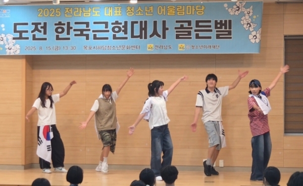 남악청소년문화의집 댄스동아리 ‘썬샤인’, 청소년 어울림마당 무대서 열띤 공연 펼쳐 [PEDIEN] 전남 무안군 남악청소년문화의집 댄스동아리 ‘썬샤인’ 이 지난 15일 목포 하당청소년문화센터에서 열린 전라남도 대표 청소년어울림마당 ‘도전 한국근현대사 골든벨’ 행사에서 화려한 공연으로 눈길을 끌었다. 5명의 청소년으로 구성된 남악청소년문화의집 댄스 동아리 ‘썬샤인’은 "캔디" 등 3곡을 약 10분간 공연하며 관객들의 큰 호응을 받았다. 특히 광복 80주년을 맞아 태극기를 활용한 패션으로 무대에 올라 의미를 더했다. 이번 공연은 전남 청소년 골든벨 퀴즈대회 축하 무대로 마련되어 ‘썬샤인’은 청소년다운 참신함을 바탕으로 남악청소년문화의집 전문 강사의 지도로 무대 연출을 다듬고 꾸준한 연습으로 완성도 높은 공연을 펼쳤다. 공연에 참여한 동아리원들은 “큰 무대에서 공연하게 되어 긴장했지만, 관객들의 응원 덕분에 즐겁게 마칠 수 있었다”, “공연 후 성취감과 뿌듯함을 느꼈다”며 소감을 전했다. 김산 군수는 “청소년들이 재능과 열정을 무대에서 마음껏 발휘하며 성장할 기회를 가지게 되어 기쁘다”며 “앞으로도 다양한 청소년 문화 활동을 지원해 청소년들이 자신감을 키우고 꿈을 실현할 수 있도록 노력하겠다”고 밝혔다. -