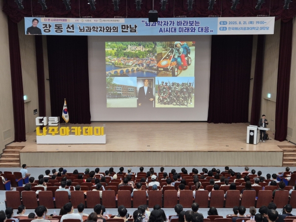 나주시, ‘더 큰 나주아카데미’ 장동선 박사 특강 성황 [PEDIEN] 전라남도 나주시가 시민의 지적 성장을 돕는 평생교육 프로그램 ‘더 큰 나주아카데미’에 장동선 박사를 초청하고 AI시대의 미래와 인간의 역할을 조명하는 특강을 500여 시민과 함께하며 지식 교류의 장을 마련했다. 나주시는 나주교육진흥재단 주관으로 최근 한국에너지공과대학교 대강당에서 ‘더 큰 나주아카데미’ 18회차 초청 특강을 개최했다고 25일 밝혔다. 강연자로 나선 장동선 박사는 ‘뇌과학자가 바라보는 AI시대 미래와 대응’을 주제로 “AI 발전이 인간의 삶을 빠르게 변화시키고 있지만 결국 중요한 것은 인간 고유의 창의성과 감성”이라고 강조했다. 이어 “뇌과학적 관점에서 본 인간의 사고력과 공감 능력은 AI가 대체할 수 없는 영역이며 미래를 살아가기 위한 핵심 경쟁력”이라고 덧붙였다. 120분 동안 진행된 특강은 철학적 통찰과 현실적 조언이 어우러진 내용으로 청중의 높은 집중과 공감을 끌어냈다. 현장에는 시민 500여명이 참여해 성황을 이뤘으며 질의응답 시간에도 다양한 질문이 이어지며 열띤 분위기가 이어졌다. ‘더 큰 나주아카데미’는 인문학, 과학, 문화 등 각 분야 전문가를 초청해 시민에게 교양과 통찰을 제공하는 나주시 대표 평생교육 프로그램이다. 오는 10월 16일에는 박위 강연가를 초청해 ‘한계를 넘어서는 도전의 힘’을 주제로 특강을 이어갈 예정이다. 윤병태 이사장은 “더 큰 나주아카데미는 시민이 지식과 교양으로 성장할 수 있는 소중한 배움의 장”이라며 “다양한 분야 명사를 초청해 시민 누구나 참여하고 공감할 수 있는 수준 높은 강연을 꾸준히 이어가겠다”고 말했다. -
