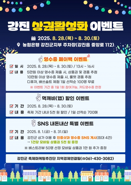 이번 이벤트는 상가 방문객 및 소비 촉진을 유도해 강진읍 골목상권의 활력을 불어넣기 위해 진행되며 주요 이벤트로는 강진사랑상품권 영수증 페이백 이벤트, 무료 체험 프로그램, 꽝 없는 돌림판 이벤트, ‘강진맛깨비’ 먹깨비 할인 이벤트, SNS 내돈내산 특별 이벤트 등이 있다.