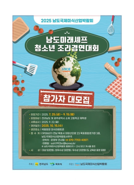 홍양현 남도국제미식산업박람회 사무국장은 “남도의 식재료로 청소년이 펼치는 이번 조리 경연은 단순한 대회를 넘어, 남도 미식에 대한 이해를 넓히고 꿈을 실현하는 특별한 경험이자 성장의 발판이 될 것”이라며 “미래 셰프들의 적극적인 도전과 참여를 기대한다”고 말했다.