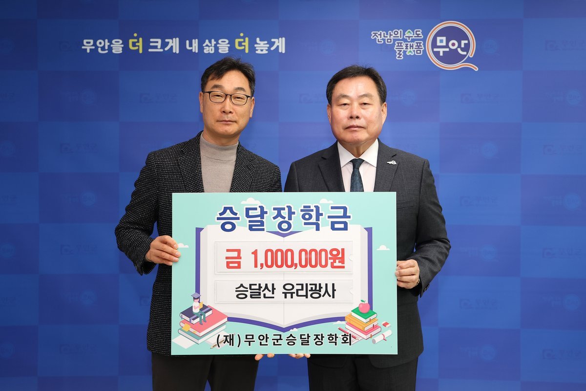 유리광사 승달장학금 기탁식 [PEDIEN] 전남 무안군은 15일 무안군 승달산 유리광사에서 지역 인재 육성을 위해 무안군승달장학회에 장학금 100만 원을 기탁했다고 밝혔다.이번 기탁금은 무안군 청계면 승달산 자락에 위치한 유리광사에서 지역에서 자라나는 학생들에게 희망을 전하고 미래인재 육성에 힘을 보태기 위해 신도들이 뜻을 모으면서 마련됐다.유리광사는 지난 2023년과 2024년 연말에도 각각 승달장학금 100만 원을 기탁하고, 목포MBC ‘희망 2026 나눔 캠페인’에 성금을 기탁하는 등 지속적으로 지역사회에 나눔을 실천해 오고 있으며, 지역 청소년과 어려운 이웃을 함께 살피는 행보는 군민들에게 큰 귀감이 되고 있다.기탁식에 참석한 김승호 신도회장은 “승달산의 맑은 기운을 품고 자라는 우리 아이들이 훗날 지역과 이웃을 위해 다시 나눔을 실천하는 어른으로 자라나길 바라는 마음”이라며 “앞으로도 신도들의 뜻을 모아 지역인재와 어려운 이웃을 위한 나눔을 멈추지 않겠다”고 밝혔다.김산 군수는 “지역인재 육성에 동참해주신 유리광사 신도분들께 깊은 감사를 드린다”며, “기탁해 주신 장학금은 그 뜻에 따라 지역 인재 양성을 위해 소중히 사용하겠다”라고 전했다. -