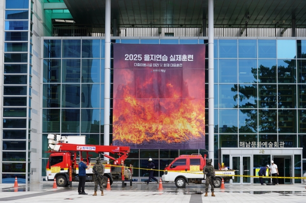 해남군, 민·관·군·경 합동 을지연습 성공적 마무리 [PEDIEN] 해남군이 민·관·군·경은 물론 전 군민이 참여한 가운데18일부터 21일까지 4일간 실시된 2025 을지연습을 성공적으로 마무리했다. 국지도발에 대비해 기관별 대응 역량을 제고하기 위해 9개 기관 100여명이 참여한 가운데 열린 이번 연습에는 기관장 주재로 체계적인 사전 준비 및 유관기관 간 긴밀한 협조체계를 구축하고 전지전환 절차 연습, 전시현안과제토의, 민방공 대피 훈련, 다중이용시설 테러에 대응한 실제훈련 등의 순으로 실전과 같이 훈련에 임했다. 특히 20일 진행된 민방공 대피훈련은 공습 경보과 함께 문화예술회관을 이용하는 군민과 해남군수를 포함한 전 직원들이 대피 훈련에 참여했다. 이날 훈련과 함께 대피 인원들을 대상으로 육군 제8539부대 1대대에서 방독면 착용 방법 교육 및 해남소방서에서 심폐소생술 교육을 진행했다. 또한 해남경찰서 해남소방서 군청 직장민방위대원 합동으로 보건소부터 축협하나로마트까지, 1km 구간 소방차 길 터주기 훈련도 병행했다. 21일에는 6개 기관 100여명이 참여한 다중이용시설 테러 대응 및 화재 진압훈련을 실시했다. 훈련은 적 드론 공격에 따른 폭발 화재, 인명구조 및 화재진압, 시설 복구 순으로 진행했다. 훈련에 함께 참여한 명현관 해남군수는“이번 을지연습을 통해 민·관·군·경이 혼연일체가 되어 빈틈없는 안보태세를 더욱 확고히 다져지는 계기가 됐다”며“특히 전 군민이 참여하는 민방공 대피훈련도 실전과 같은 훈련으로 비상상황과 각종 재난 시 군민들의 생명과 재산을 보호할 수 있도록 역량을 강화하는 훈련이 됐다”고 전했다. -