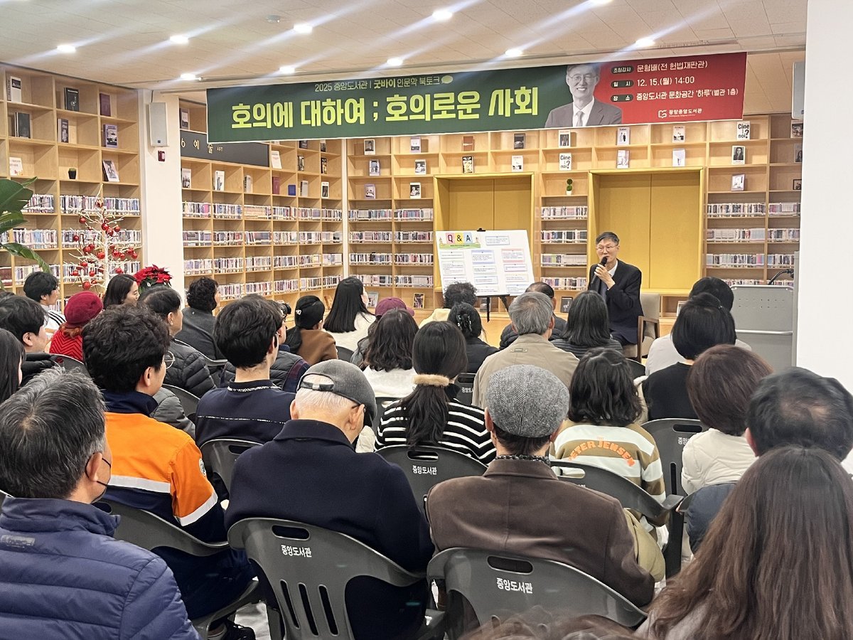 광양중앙도서관 문형배 전 헌법재판관 초청 북토크 성료 - 도서관과 현장 [PEDIEN] 광양중앙도서관은 지난 15일 중앙도서관 문화공간 ‘하루’에서 「굿바이 인문학 북토크」를 개최했다.이번 북토크에는 전 헌법재판관이자 「호의에 대하여」의 저자인 문형배 작가를 초청해 ‘호의에 대하여: 호의로운 사회’를 주제로 강연을 진행했다. 문 작가는 저서의 주요 내용을 바탕으로 법과 사회를 바라보는 자신의 시각을 시민의 눈높이에 맞춰 풀어냈다.특히 강연 이후에는 약 50분간의 질의응답 시간을 운영해, 시민들이 법과 사회, 일상 속 판단과 선택에 대해 자유롭게 질문하고 의견을 나누는 소통의 장이 마련됐다. 이를 통해 일방적인 강연을 넘어 참여자 중심의 북토크가 이뤄졌다는 평가를 받았다.참여자들은 “법이라는 주제가 어렵게 느껴졌지만 일상적인 사례로 설명해 이해하기 쉬웠다”며 “딱딱할 수 있는 내용을 친근하게 풀어줘 강연 내내 편안하게 들을 수 있었다”고 소감을 전했다.김현숙 도서관과장은 “연말을 맞아 시민들이 본인의 삶과 사회를 함께 돌아볼 수 있는 인문학 프로그램을 마련했다”며 “앞으로도 시민의 일상과 맞닿은 주제를 중심으로 공감과 소통이 있는 인문 프로그램을 꾸준히 운영해 나가겠다”고 밝혔다. -