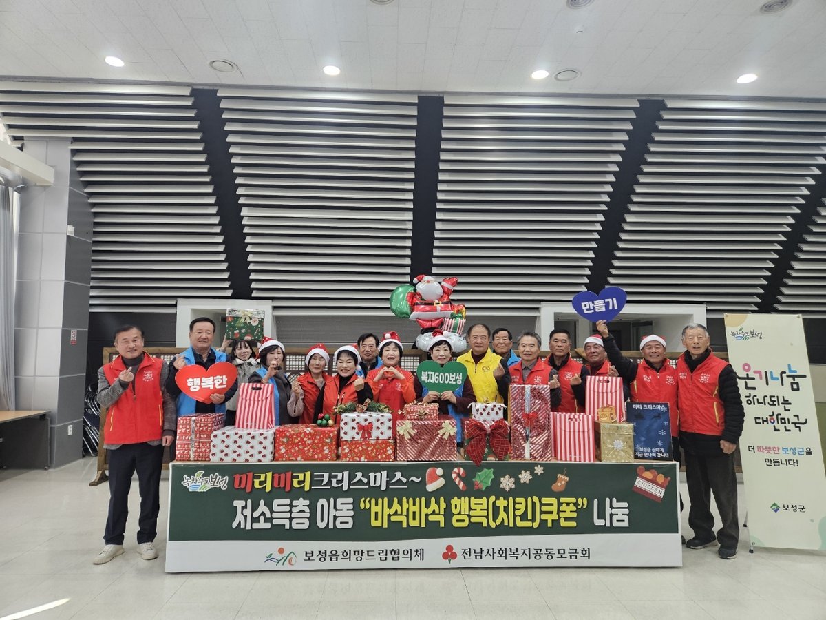 보성군 보성읍 저소득층 아동 바삭바삭 행복 쿠폰 지원 보성군 보성읍에서 바삭바삭 행복쿠폰 지원 사업을 했다 [PEDIEN] 보성군 보성읍은 15일, 보성읍희망드림협의체 주관으로 저소득층 가정 아동 48가구에 ‘바삭바삭 행복 쿠폰’ 지원사업을 추진했다고 밝혔다.이번 사업은 크리스마스를 앞두고 취약계층 아동에게 정서적 위로와 따뜻한 추억을 전하고, 연말 가족 간의 소중한 시간을 응원하기 위해 마련됐다.‘행복 쿠폰’은 가족이 함께 나눌 수 있는 치킨교환권으로, 연말 가족들 간의 유대감 형성과 아동의 정서적 안정에 실질적인 도움이 될 수 있도록 기획됐다.보성읍희망드림협의체는 대상 가구에 치킨교환권을 직접 전달하며, 이번 나눔이 아이들의 연말 소외감 해소는 물론 지역사회 전반의 돌봄 문화 확산으로 이어질 것으로 기대하고 있다.보성읍 희망드림협의체 안재섭 위원장은 “행복쿠폰은 치킨교환권이지만, 아이들에게는 그보다 큰 응원의 마음”이라며“앞으로도 도움이 필요한 가정을 향해 가장 먼저 다가가는 든든한 이웃이 되겠다.”라고 말했다.김기성 보성읍장은“아이 한 명의 웃음을 지키는 일이 한 마을의 힘을 키운다.”라며 “희망드림협의체와 함께 아이들이 걱정 없이 자라날 수 있는 보성읍, 아이들의 행복을 온 마을이 함께 지켜주는 보성읍을 만들기 위해 지속적으로 지원을 확대하겠다.”라고 밝혔다. -