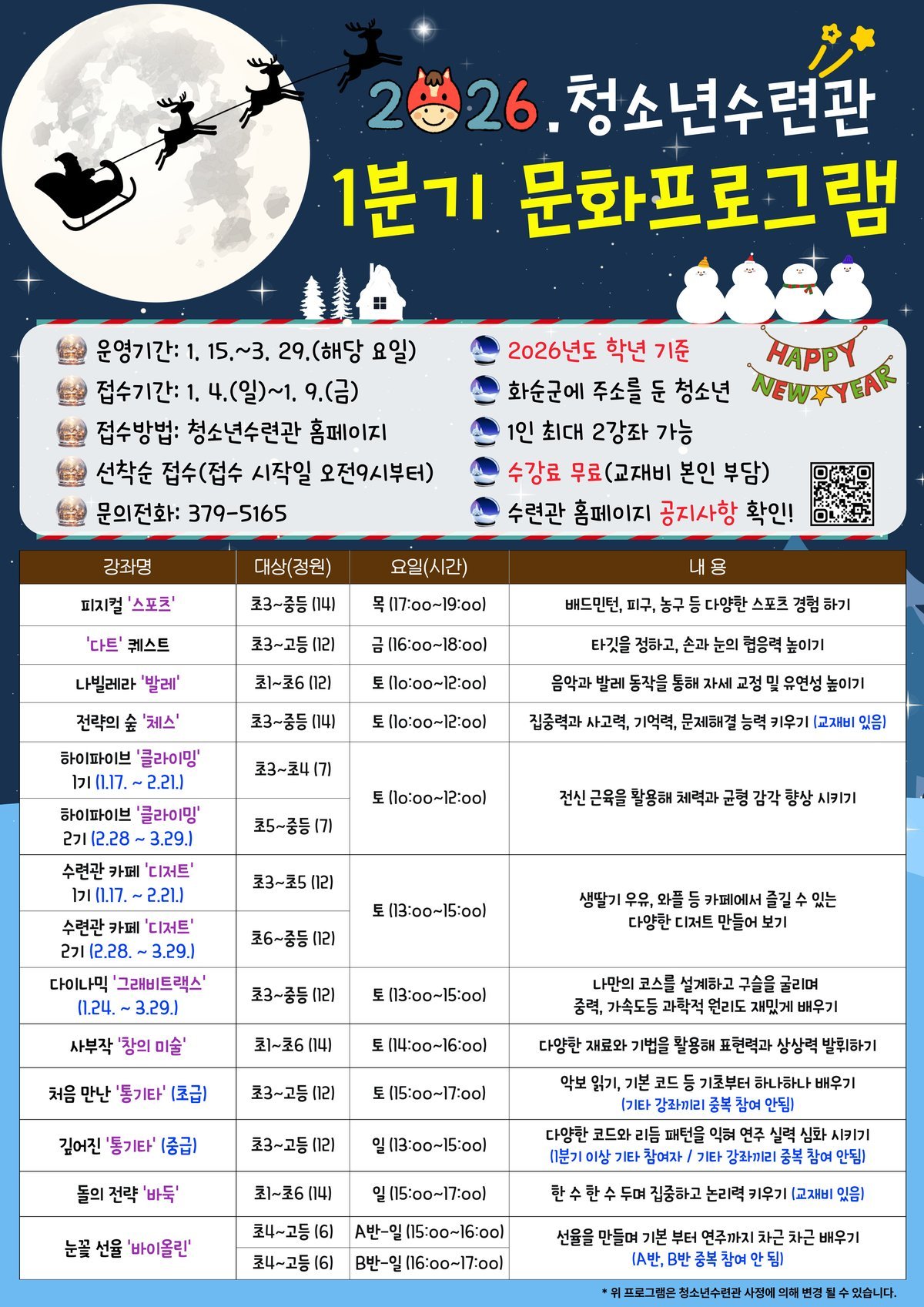 청소년수련관 1분기 문화 프로그램 웹포스터 화순군 제공 [PEDIEN] 화순군이 2026년 새해를 맞아 청소년들의 성장을 돕기 위해 1분기 문화 프로그램을 운영하며, 1월 4일부터 9일까지 참가자 166명을 선착순으로 모집한다고 밝혔다.이번 프로그램은 지역 청소년들이 문화, 예술, 신체활동, 자기계발 등 다양한 분야에서 주도적으로 참여하고 성취감을 얻을 수 있도록 기획되었다.청소년들이 건강한 여가 문화를 만들고, 친구들과의 교류를 통해 사회성과 협동심을 키울 수 있도록 지원하는 데 목적을 둔다.운영되는 프로그램은 스포츠, 다트, 발레, 체스, 카페 디저트, 클라이밍, 창의 미술, 통기타, 그래비트랙스, 바둑, 바이올린 등 총 12개의 강좌로 구성되어 있다. 청소년들의 다양한 관심사와 요구를 반영한 것이 특징이다.화순군은 이번 프로그램을 통해 청소년들이 다양한 경험을 쌓고 잠재력을 발견하는 기회를 제공하고자 한다.참가 신청은 1월 4일부터 9일까지 화순군청소년수련관 홈페이지를 통해 온라인으로 접수받는다.1분기 프로그램은 1월 15일부터 3월 29일까지 운영되며, 화순군에 거주하는 청소년이라면 누구나 참여할 수 있다.자세한 일정과 강좌별 세부 내용은 화순군청소년수련관 홈페이지에서 확인하거나, 문화 프로그램 담당자에게 문의하면 된다. -