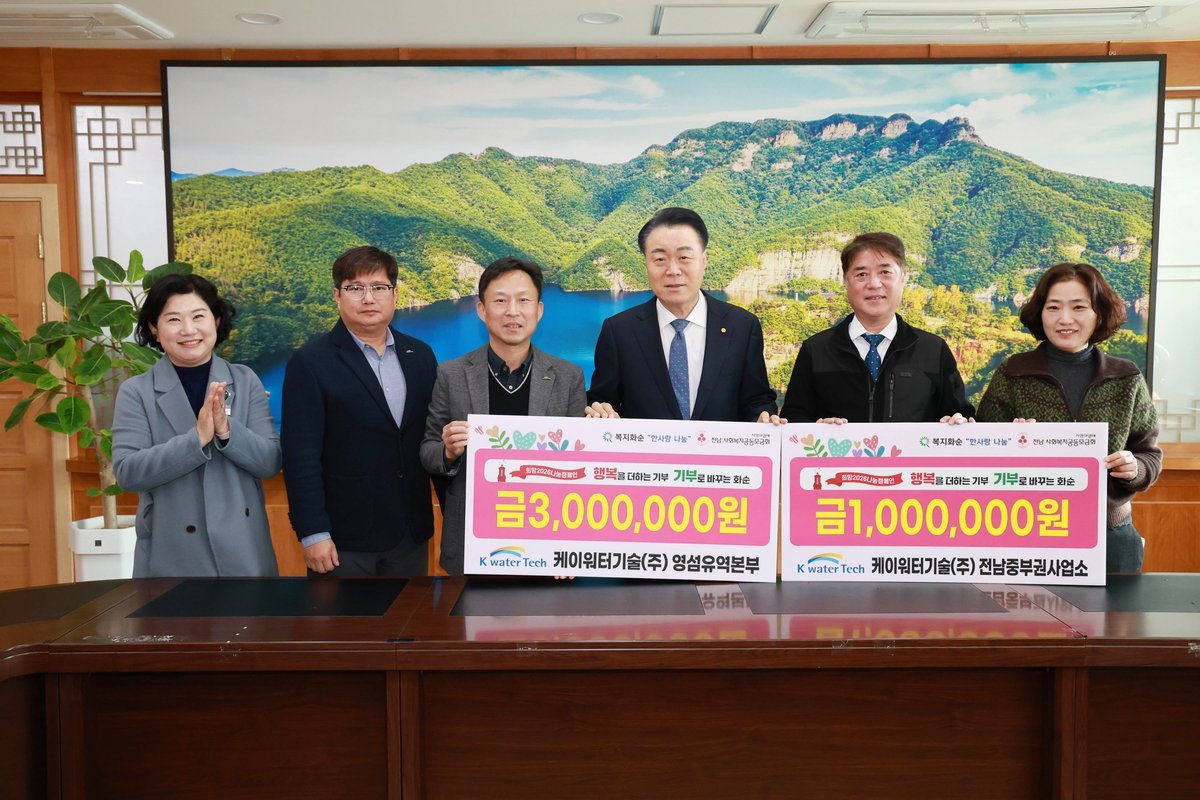케이워터기술 주 영 섬유역본부와 전남중부권사업소 기탁식 기념사진 구복규 화순군수 왼쪽 이한기 영 섬유역본부 본부장 유민 팀장 화순군 제공 [PEDIEN] 화순군은 지난 15일 ‘희망2026나눔캠페인’이 활발히 진행되는 가운데 케이워터기술 영·섬유역본부와 전남중부권사업소가 관내 취약계층을 위해 현금 400만 원을 기부했다고 밝혔다.케이워터기술는 한국수자원공사의 자회사로 광역상수도 및 댐·발전 시설에 대한 점검·정비를 수행하는 전문 기관이다.영·섬유역본부와 전남중부권사업소는 상수도 점검·정비뿐만 아니라, 화순 지역에서 활발한 자원봉사 활동도 펼치고 있다.이한기 영·섬유역본부 본부장은 “공공의 복리를 우선시하고 공공성 및 기성을 조화시켜 사회적 가치 창출에 최선을 다하는 우리 기관의 목표”라며, “우리의 기부와 자원봉사가 세상을 조용하지만 따뜻하게 흐르는 원동력이 된다면 좋겠다”라고 말했다.허선심 사회복지과장은 “이웃을 생각하는 따뜻한 마음, 마음을 나누려는 행동을 직접 보여 주신 케이워터기술 영·섬유역본부와 전남중부권사업소 관계자분들께 감사의 말씀을 드린다”라며, “이러한 나눔 사례는 널리 알려 겨울철 복지 위기 가구를 적극 발굴하고, 소외 없는 군민 만들기에 힘쓰겠다”라고 말했다.한편, 화순군은 12월 1일부터 2026년 1월 31일까지 2개월간 ‘희망2026나눔캠페인’을 진행한다.기부를 희망하는 주민은 읍·면 행정복지센터 맞춤형복지팀이나 방송사 모금 접수 등을 통해 참여할 수 있다.모금된 기부금은 저소득층 생계비 및 의료비, 화재 복구 및 재해·재난, 긴급 지원, 농어촌 어르신 및 장애인 등 복지 서비스 제공을 위한 차량 지원, 기타 복지사업의 재원으로 쓰인다. -