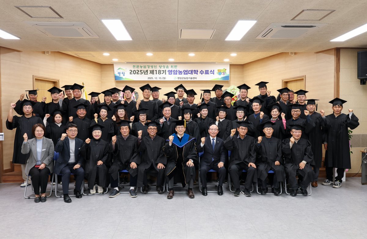 영암농업대학 수료식 [PEDIEN] 영암군이 15일 영암군농업기술센터에서 ‘2025년 영암농업대학 수료식’을 열고, 제18기 무화과·한우 과정 수료생 49명을 배출했다.무화과 과정 수료생들은 올해 4/3일부터 총 22회 86시간, 한우 과정 수료생들은 6/19일부터 총 18회 74시간 전문가의 현장 중심 교육을 받았다.수료생들은 앞으로 농업대학 배움을 바탕으로 기술 기반 농업경영으로 기후위기 등 전환기 영암농업을 이끌어 갈 예정이다.수료식에서 무화과 과정의 김진상 수료생은 농촌진흥청장 공로상을, 한우 과정의 황주영 수료생은 농촌진흥청장 최우수상을 받는 등 총 5명이 수상했다.우승희 영암군수는 “어려운 여건 속에서도 현장 기술, 경영 역량을 높인 농업대학생들의 수료를 축하한다. 생산 현장에서 무화과와 영암한우 경쟁력 강화를 위해 매진해달라”고 말했다.수료생 대표 김진상 씨는 “이론과 실습을 병행한 교육이 영농에 큰 도움이 됐고, 배운 내용을 현장에서 적극 활용하겠다”고 밝혔다.영암군농업기술센터는 2008년부터 영암농업대학으로 총 690명의 수료생을 배출했고, 내년부터는 무화과 과정, 전통주 소믈리에 자격취득 과정도 운영하는 등 현장 중심 농업교육으로 경쟁력을 강화해 나간다는 방침이다. -