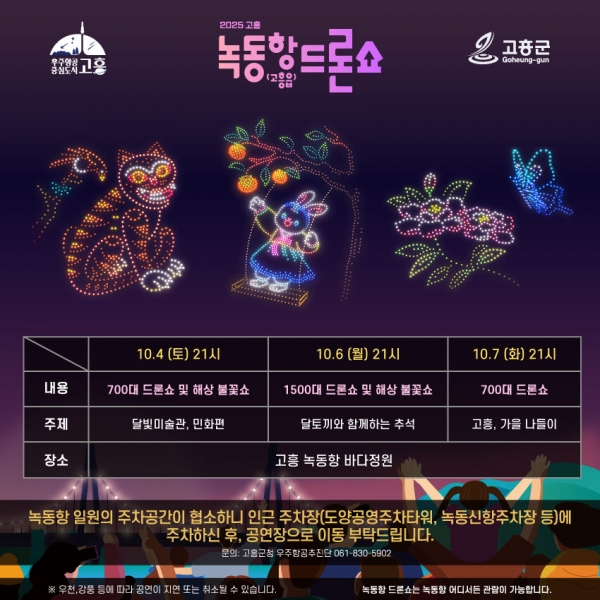 고흥군, 추석맞이 녹동항 드론쇼 및 해상불꽃쇼 특별공연 개최 [PEDIEN] 고흥군은 민족 대명절 추석을 맞아 오는 10월 4일 6일 7일 3일간 녹동항 바다정원 일원에서 드론쇼 및 해상불꽃쇼를 개최한다고 밝혔다. 이번 행사는 △10월 4일 ‘달빛미술관 △10월 6일 ‘달토끼와 함께하는 추석’△10월 7일 ‘고흥, 가을나들이’라는 주제로 진행되며 행사 당일 낮에는 제기, 굴렁쇠, 투호 등 전통놀이 체험 공간을 마련해 녹동항 방문객들이 명절 분위기를 즐길 수 있도록 할 예정이다. 특히 10월 6일 추석 당일에는 1,500대 규모의 드론에 불꽃을 부착한 불꽃드론쇼를 선보여 공연의 질을 높이고 군민과 귀성·관광객들에게 잊지 못할 추억의 가을밤을 선물할 계획이다. 더불어 추석 연휴 특별공연에 많은 인파가 몰릴 것을 대비해 안전대책을 수립하고 유관기관과 지역 사회단체와 긴밀히 협력하는 등 행사 준비를 철저히 준비할 예정이다. 공영민 군수는 “추석 연휴를 맞아 고흥을 찾는 방문객을 위해 특별한 드론쇼와 해상불꽃쇼, 버스킹 공연 등 다양한 볼거리를 준비했다”며 “새롭게 변화하는 고흥의 매력을 느끼고 잊지 못할 추억을 만들길 바란다”고 전했다. 한편 2023년부터 개최한 녹동항 드론쇼는 누적 관광객 51만여명, 439억원의 경제적 효과를 거둔 것으로 분석되며 이를 통해 고흥의 대표 관광 콘텐츠로 자리매김했다는 평가를 받고 있다. 고흥군 녹동항 드론쇼는 오는 10월 25일 폐막식을 앞두고 있으며 강우, 강풍 등 기상 여건에 따라 일정이 변경될 수 있다. -