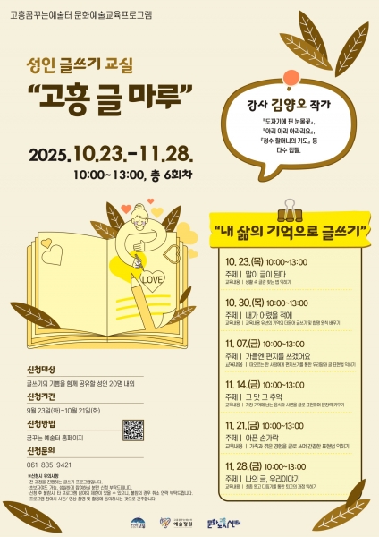 고흥군, 성인 글쓰기 교실 ‘고흥 글마루’ 운영 [PEDIEN] 고흥군과 고흥군문화도시센터는 오는 10월부터 11월까지 ‘성인 글쓰기 교실: 고흥 글마루’를 운영한다고 밝혔다. 이번 프로그램은 고흥의 중장년층을 대상으로 평범한 일상 속 경험을 글로 풀어내고 서로의 이야기를 나누는 과정을 통해 자존감과 성취감을 높이는 것을 목표로 한다. ‘고흥 글마루’는 총 6주 과정으로 △자기 이름 삼행시 짓기 △어린 시절 기억과 가족 이야기 △추억의 음식 글쓰기 △마음속 인물에게 편지 쓰기 등으로 구성된다. 마지막 시간에는 그동안 작성한 글을 다듬어 낭독하고 이를 하나의 소책자로 엮는다. 서성훈 센터장은 “글쓰기를 통해 자신의 삶을 돌아보고 함께 나눈 글이 소책자와 전시로 이어지는 경험은 일상의 이야기가 곧 지역의 문화 기록이 될 수 있다는 것을 보여줄 것”이라고 말했다. 참여자들은 글쓰기 학습을 넘어 서로의 글을 합평하며 공동체적 유대감을 쌓게 된다. 프로그램 마지막에는 낭독회와 전시회를 열어 결과물을 공유할 예정이다. -