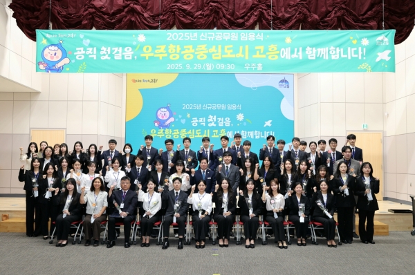 고흥군 새내기 공무원 53명 임용장 수여식 가져 [PEDIEN] 고흥군은 29일 군청 우주홀에서 신규 공무원 53명을 대상으로 임용장 수여식을 개최했다고 밝혔다. 이번 임용식은 새내기 공무원의 ‘공직 첫걸음’을 축하하고 새로운 출발을 응원하기 위해 마련된 자리로 고흥군은 신규 공무원의 후생복지를 강화해 공직 만족도를 높이겠다는 방침이다. 이날 행사에서는 임용장 수여와 함꼐 신규 공무원의 첫 출발을 축하하는 환영의 의미를 담은 ‘웰컴 텀블러’ 와 ‘환영 꽃다발’ 이 전달됐다. 웰컴 텀블러는 공직 생활에서 실용적으로 활용할 수 있도록 마련했으며 꽃다발은 새로운 도전을 응원하는 뜻을 담아 증정했다. 공영민 군수는 인사말에서 “여러분 한 분 한 분의 역할이 군민의 삶과 지역 발전에 큰 힘이 될 것”이라며 “고흥군은 신규 공무원의 주거 문제 등 후생복지 향상에 앞장서며 일하고 싶은 직장문화를 만들어가겠다”고 강조했다. 신규 공무원들은 임용식을 마친 후 각 부서에 배치돼 본격적인 업무를 시작하게 되며 군민을 위한 봉사와 군정 발전을 이끌 핵심 인력의 역할을 기대하고 있다. -