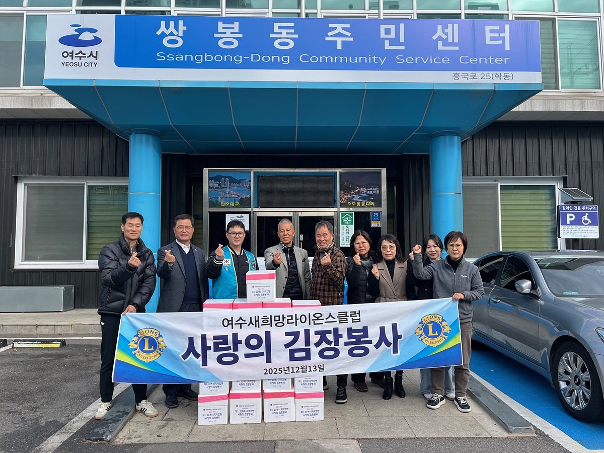여수 새희망라이온스클럽, 만덕동·쌍봉동에 김장김치 기탁 (여수시 제공) [PEDIEN] 여수 새희망라이온스클럽이 지난 13일, 지역 내 취약계층의 따뜻한 겨울나기를 위해 김장김치 총 39박스를 만덕동과 쌍봉동에 기탁하며 훈훈한 나눔을 실천했다.이번 김장 나눔은 추운 겨울을 맞아 지역 사회의 어려운 이웃들에게 따뜻한 온정을 전하고, 건강한 겨울을 보낼 수 있도록 지원하기 위해 마련됐다. 새희망라이온스클럽 회원들의 자발적인 참여와 후원으로 김장김치를 준비했다.만덕동에는 김장김치 5kg 14박스가 전달되었으며, 쌍봉동에는 25박스가 전달되어 관내 경로당 25곳에 각 1박스씩 전달될 예정이다. 경로당을 이용하는 어르신들에게 따뜻한 겨울 식사를 제공할 수 있게 됐다.임정택 새희망라이온스클럽 회장은 “회원들의 정성이 담긴 김장김치가 어려운 이웃들에게 조금이나마 따뜻한 위로가 되기를 바란다”며, “앞으로도 지역사회와 함께하는 다양한 사회공헌 활동을 지속적으로 펼쳐나가겠다”고 밝혔다.한편, 여수 새희망라이온스클럽은 지난 10월에도 화장지, 참치 세트, 컵라면 등을 경제적으로 어려움을 겪는 가정에 전달하는 등 꾸준한 봉사활동을 이어오고 있다. 취약계층 지원뿐만 아니라 환경정화 활동 등 다양한 분야에서 사회공헌 활동을 펼치며 지역사회에 기여하고 있다. -
