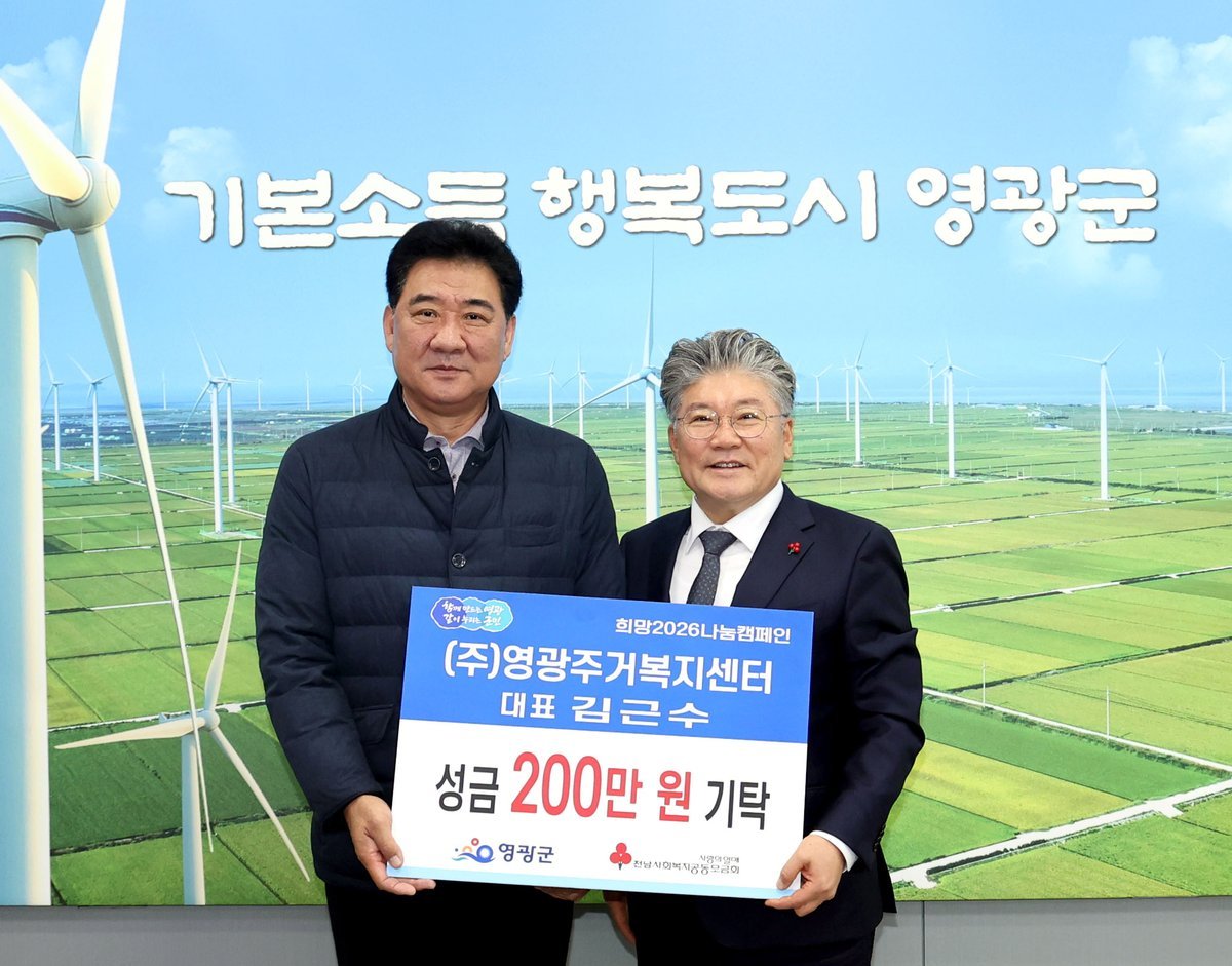 연말 성금 기탁 및 장학 기금 기부 [PEDIEN] 영광군은 지난 12일 영광주거복지센터에서 이웃돕기 성금 200만 원을 기탁하여 희망2026나눔캠페인에 참여했다고 밝혔다.㈜영광주거복지센터는 영광읍 단주리에 소재한 지역 기반 기업으로, 2014년 전남영광지역자활센터 자활기업으로 출발해 현재는 주택개조 및 집수리 등을 주요 사업으로 운영하고 있다.영광주거복지센터는 지역사회와 상생하는 기업으로서의 사회적 책임을 실천하기 위해 2017년부터 방역마스크, 손세정제 등 방역용품과 이웃돕기 성금을 매년 꾸준히 기부하며 나눔 활동을 이어오고 있다.성금을 기탁한 김근수 대표는 “자활기업으로 출발해 지역의 도움으로 성장해 온 만큼, 다시 지역사회에 환원하는 것이 당연한 책임이라고 생각한다”라며 “앞으로도 주거환경 개선 사업과 더불어 나눔과 상생을 실천하는 기업이 되겠다”라고 말했다.사회복지과장은 “자활기업에서 시작해 지역의 든든한 주거복지 파트너로 성장한 영광주거복지센터의 지속적인 나눔에 깊이 감사드린다”라며, “이러한 선한 실천이 지역사회 전반에 따뜻한 나눔 문화를 확산시키는 밑거름이 될 것”이라고 전했다.한편, 영광주거복지센터가 기탁한 성금은 관내 취약계층과 복지 사각지대 이웃을 지원하는 데 소중히 사용될 예정이다. -