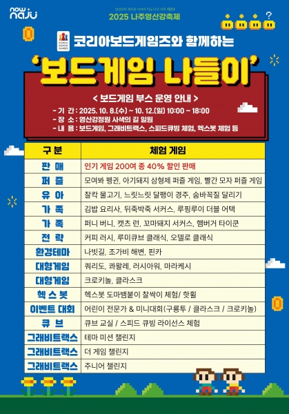 나주시, 영산강축제서 ‘보드게임 나들이’ 운영 [PEDIEN] 전라남도 나주시가 오는 10월 8일부터 12일까지 열리는 ‘2025 나주영산강축제’에서 남녀노소 누구나 즐길 수 있는 ‘보드게임 나들이’를 운영한다. 26일 나주시(시장 윤병태)에 따르면 ‘보드게임 나들이’는 국내 최대 보드게임 업체 코리아보드게임즈와 협력해 다양한 체험과 인기 보드게임 할인 판매를 마련했다. 보드게임뿐만 아니라 그래비트랙스, 스피드큐빙, 헥스봇 등 다양한 체험형 게임을 준비해 남녀노소 누구나 즐길 수 있도록 구성해 축제를 찾은 가족과 시민들에게 새로운 즐거움과 혜택을 선사할 예정이다. 특히 유아부터 성인까지 참여할 수 있는 난이도별 게임을 준비해 온 가족이 함께 즐기는 최적의 체험 기회를 제공할 전망이다. 또한 축제 기간에 200여 종의 인기 보드게임을 최대 40% 할인된 가격에 구매할 수 있는 특별 판매 부스도 운영한다. 평소 보드게임에 관심 있는 이들이나 새로운 게임을 접하고 싶은 방문객에게는 놓칠 수 없는 기회다. 윤병태 나주시장은 “온 가족이 함께 모여 소통하고 즐길 수 있는 축제의 새로운 장이 될 것”이라며 “많은 시민과 관광객이 참여해 풍성한 체험과 혜택을 누리길 바란다”고 밝혔다. 한편 ‘보드게임 나들이’ 프로그램의 자세한 일정과 내용은 나주영산강축제 공식 블로그와 SNS 채널을 통해 확인할 수 있다. -