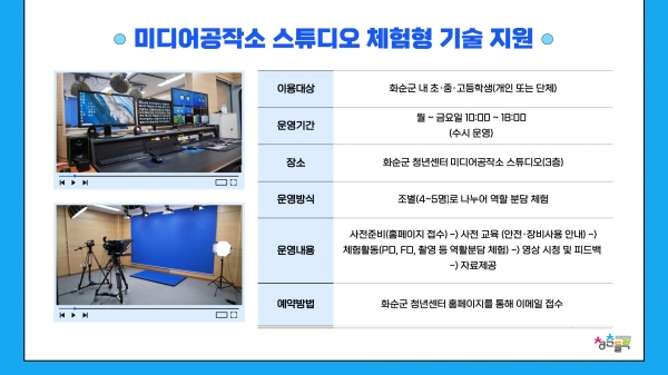 미디어공작소 청소년의 창의적 활동을 위한 스튜디오 체험형 기술 지원 [PEDIEN] 화순군은 청소년들의 창의적 활동을 지원하고 진로 탐색의 기회를 제공하기 위해 화순군 청년센터 미디어공작소 스튜디오를 무료로 개방, 체험형 기술 지원 프로그램을 운영하고 있다고 26일 밝혔다. 스튜디오 체험형 기술 지원은 방송 제작, 영상 촬영·편집, 크로마키, 조명, 인터뷰 실습 등 다양한 과정을 직접 경험할 수 있도록 구성됐다. 특히 참여 학생들을 조별 4~5명 단위로 나누어, PD·FD·촬영자·편집자 등 역할을 분담해 실제 방송 제작 현장과 유사한 협업 체험이 가능하다. 운영은 매주 월요일부터 금요일까지 오전 10시부터 오후 6시까지 진행되며 화순군 내 초·중·고등학생이라면 누구나 참여할 수 있다. 신청은 화순군 청년센터 홈페이지에서 신청서를 받아 작성한 뒤 이메일로 접수하면 된다. 조미화 인구청년정책과장은 “미디어공작소 스튜디오는 단순한 체험 공간이 아니라, 청소년들이 미래의 꿈을 탐색하고 디지털 역량을 키울 수 있는 창의적 교육의 장으로 앞으로도 다양한 체험형 프로그램을 통해 학생들의 미디어 활용 능력 향상을 적극 지원하겠다”고 말했다. -