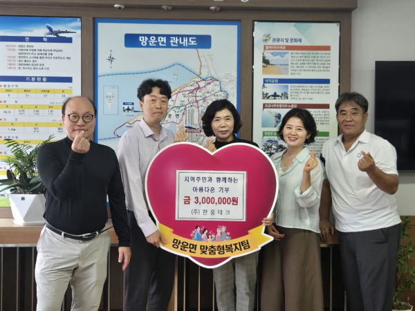 무안군 ㈜한웅테크, 지역사회 상생 성금 300만원 전달 [PEDIEN] 무안군 망운면은 지난 25일 ㈜한웅테크가 지역의 사회적 약자와 어려운 이웃을 위해 사용해 달라며 이웃사랑 성금 300만원을 기탁했다고 밝혔다. ㈜한웅테크 관계자는 “기업의 사회적 책임을 다하기 위해 다양한 사회공헌 활동을 이어가고 있다”며 “앞으로도 지역사회와 함께 성장하는 회사가 될 수 있도록 꾸준히 나눔 활동을 펼쳐 나가겠다”고 말했다. 김지윤 망운면장은 “지역사회의 어려운 이웃들을 위해 따뜻한 마음을 전해주신 ㈜한웅테크에 깊이 감사드린다”며 “기탁된 성금은 도움이 절실히 필요한 가정에 소중히 사용될 수 있도록 세심히 살피겠다”고 전했다. -