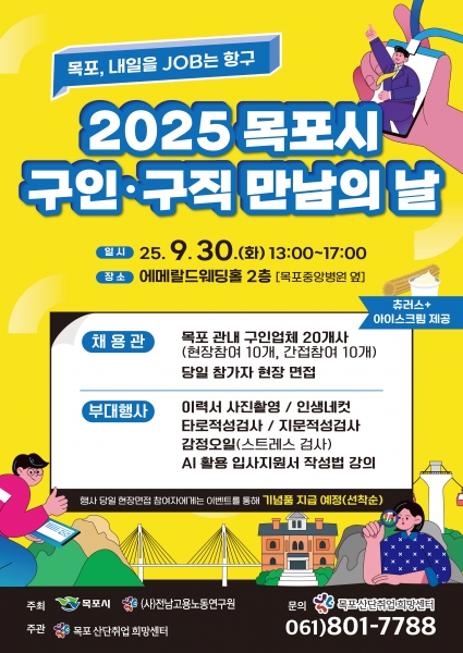 목포시, ‘2025 목포시 구인·구직 만남의 날’ 개최 [PEDIEN] 목포시는 오는 9월 30일 오후 1시, 에메랄드웨딩홀 2층에서 ‘2025 목포시 구인·구직 만남의 날’ 행사를 개최한다고 밝혔다. 이번 행사는 목포시가 주최하고 전남고용노동연구원이 주관하며 지역 구인기업 20개사가 참여해 기업 설명회와 현장 면접을 진행한다. 대상은 미취업 청년, 중장년, 경력단절여성 등 연령에 제한이 없는 구직자이며 취업지원 서비스를 제공하는 소통과 기회의 장이 될 예정이다. 또한 고용복지+센터, 상공회의소, 여성인력개발센터, 목포시 청년일자리통합센터, 한국폴리텍대학 전남캠퍼스, 목포대학교, 해양경찰정비창 등 유관기관이 함께 참여해 일자리 정보관을 운영, 다양한 채용 정보와 취업 지원 프로그램을 제공한다. 행사장에서는 이력서 사진 촬영, 인생네컷, 지문·타로 적성검사, 감정 오일테라피를 통한 스트레스 검사, 푸드트럭 등 부대 프로그램도 마련해 구직자들이 즐겁게 참여할 수 있도록 준비했다. 시 관계자는 “이번 행사를 통해 지역 내 구인기업과 구직자가 원활히 만날 수 있는 장을 마련하고 다양한 채용 정보와 현장 면접 기회를 제공해 지역 고용 활성화에 기여할 것”이라며 “시민 여러분의 많은 관심과 참여를 바란다”고 전했다.