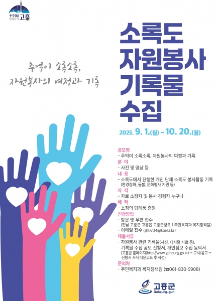 고흥군, 소록도 자원봉사 기록물 수집 공모 추진 [PEDIEN] 고흥군은 오는 10월 20일까지 전국의 개인·단체 자원봉사자가 소장하고 있는 소록도 자원봉사 기록물 수집 공모를 추진한다고 밝혔다. 이번 공모는 소록도에서 자원봉사에 참여한 분들의 사진이나 영상 등을 수집해 봉사자들의 공감대를 형성하고 추억을 되새기며 자원봉사 참여문화를 확산하기 위해 추진한다. 공모 대상은 개인 또는 단체가 가지고 있는 소록도 봉사활동 사진, 영상 등 자원봉사 활동을 보여줄 수 있는 기록물이다. 군은 공모 참여자에게 소정의 답례품을 증정하며 수집된 기록물은 고흥군에 기증돼 추후 마리안느·마가렛 봉사대상 시상식, 자원봉사자대회 등 다양한 행사에서 전시될 예정이다. 군 주민복지과 관계자는 “소록도 봉사활동은 지역을 넘어 전 세계에 울림을 준 숭고한 역사로 기록물 보존 시스템을 구축해 공모에 접수된 자료는 체계적으로 관리할 계획이다”고 말했다. 한편 소록도 자원봉사 기록물 수집 공모 참여는 고흥군 대표 누리집에서 신청서를 내려받아 작성한 후 이메일이나 우편으로 신청서를 제출하면 된다. 자세한 내용은 주민복지과를 통해 안내받을 수 있다. -
