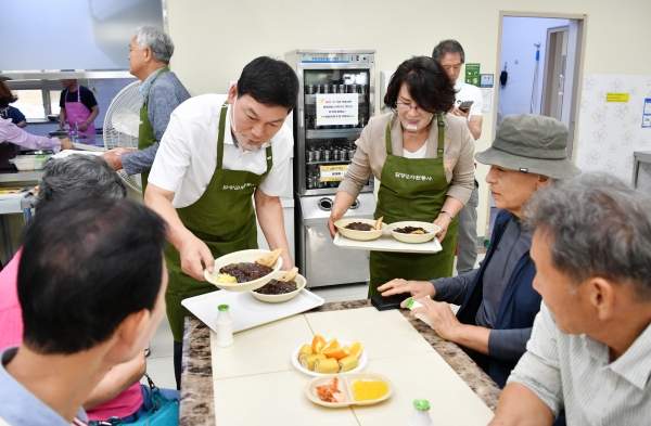정철원 군수는 이날 어르신들에게 직접 자장면을 나눠드리고 안부를 살피며 따뜻한 마음을 전했다.