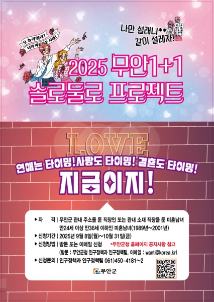 이번 솔로둘로 프로젝트 참가 대상은 무안군 거주 직장인 또는 군내 직장을 둔 미혼남녀이며 신청은 2025년 9월 8일부터 10월 31일까지, 방문 또는 이메일로 신청할 수 있다.