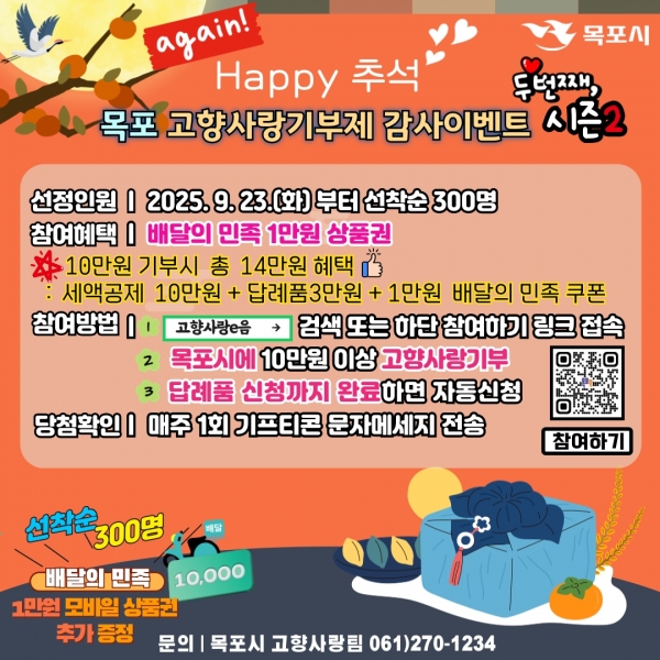[PEDIEN] 목포시는 지난 16일부터 진행한 추석 명절맞이 고향사랑기부제 참여 이벤트가 기부자들의 뜨거운 성원에 힘입어 단 3일 만에 조기 종료됨에 따라, 후속 행사인 ‘Happy 추석~ 목포 고향사랑기부제 감사이벤트 시즌2’를 추진한다고 밝혔다.
