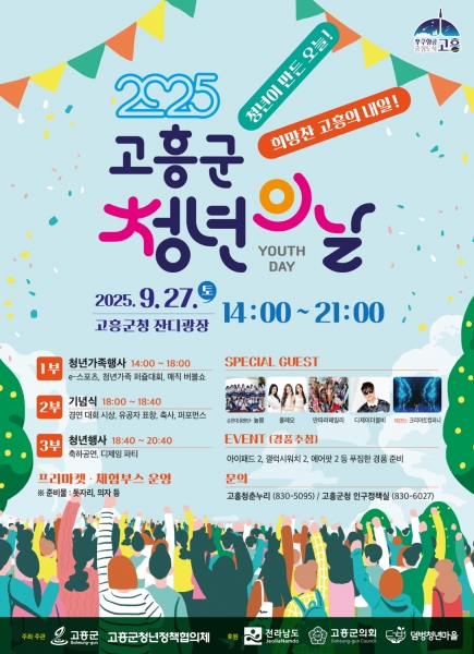 고흥군, ‘2025년 고흥군 청년의 날’ 군청 잔디광장에서 개최 [PEDIEN] 고흥군(군수 공영민)은 오는 9월 27일 고흥군청 잔디광장에서 ‘2025년 고흥군 청년의 날’ 행사를 개최한다고 밝혔다. 올해 행사는 ‘청년이 만든 오늘 희망찬 고흥의 내일’ 이라는 슬로건으로 청년이 주인공이 되는 축제의 장으로 마련되며 청년의 도전과 열정을 응원하기 위한 뜻깊은 자리가 될 예정이다. 1부 행사는 오후 2시부터 청년과 가족이 함께할 수 있는 퍼즐대회와 e-스포츠대회가 진행되며 아이들을 위한 매직버블쇼와 케이크 만들기 등 다채로운 체험 프로그램 및 프리마켓도 운영된다. 2부 기념식에서는 청년·가족 퍼즐대회와 e-스포츠 대회 시상식, 청년정책 발전에 기여한 유공자 표창, 퍼포먼스가 이어진다. 3부 청년 콘서트는 순천대학교 응원단 ‘늘봄’의 축하공연을 시작으로 가수 클레오, 딴따라패밀리, DJ 더블비 등이 출연해 축제 분위기를 한껏 끌어올릴 예정이다. 군 인구정책실 관계자는 “이번 행사는 청년들에게는 힘찬 미래를 향한 도전과 교류의 장이 되고 군민들에게는 청년의 가능성을 재확인하는 소중한 시간이 될 것”이라며 “지역의 청년들과 군민들의 많은 참여를 바란다”고 말했다. -