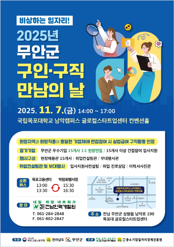 무안군, ‘2025년 구인·구직 만남의 날’ 참여기업 모집 [PEDIEN] 전남 무안군은 오는 11월 7일 목포대학교 남악캠퍼스 글로컬스타트업센터 컨벤션홀에서 개최하는 ‘2025년 무안군 구인·구직 만남의 날’행사에 참여할 기업을 모집한다. ‘비상하는 일자리’라는 주제로 무안군이 주최하고 전남인력개발원이 주관하는 이번 행사는 구직자와 관내 우수기업 간 만남을 통해 구직자에게 취업기회를, 구인업체에는 인재채용의 기회를 제공하기 위해 열리는 원스톱 일자리 지원사업의 일환이다. 군은 행사 당일 현장채용관 15개사와 함께 취업컨설팅, 입사지원서 컨설팅, 취업·진로상담, 이력서 사진관 등 다양한 부대행사를 운영해 구직자들의 취업역량 강화에 도움을 줄 계획이다. 참여를 희망하는 기업은 10월 22일까지 군청 홈페이지 공지사항란의 참가신청서를 작성해 전남인력개발원 또는 군청 미래성장과에 방문하거나 전자우편으로 제출하면 된다. 구직자는 별도 사전 신청 없이 행사 당일 면접 서류를 지참하고 현장을 방문하면 된다. 김산 군수는 “이번 행사가 인력난을 겪는 기업과 양질의 일자리를 찾는 구직자가 함께 상생하는 기회의 장이 되길 바란다”며 “도내 우수한 기업들의 많은 관심과 참여를 기대한다”고 전했다. -