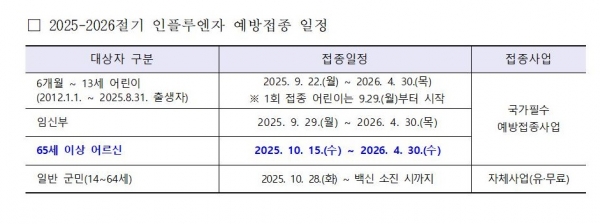 접종 대상은 생후 6개월~13세 어린이, 임신부, 65세 이상 어르신이며 초기 혼잡을 방지하기 위해 대상별로 접종 시작일을 달리한다.