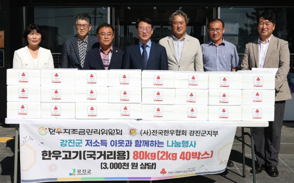 강진군 한우협회, 추석맞이 사랑의 한우 나눔 행사 [PEDIEN] 한우자조금 관리위원회와 전국한우협회 강진군지부가 관내 저소득층 가구에 전달해 달라며 300만원 상당의 한우고기 40박스를 강진군에 1일 기탁했다. 김은주 회장은 “민족대명절 추석을 맞아 관내 소외계층에게 건강과 행복을 전하고 나눔을 실천하기위해 기탁했다”며 “이번 작은 나눔이 어려운 이웃들에게 큰 힘이 되길 바란다”고 말했다. 그는 이어 “앞으로도 모두가 함께 더불어 살아가는 따뜻한 강진을 만드는데 한우협회가 앞장 서겠다”고 덧붙였다. 강진원 강진군수는 “한우가격 하락 등 한우산업이 어려운 상황임에도 소외된 이웃을 잊지 않고 따뜻한 마음으로 나눔을 실천해 한 관계자 여러분들께 깊은 감사의 말씀을 전한다”며 “농가 경영안정 사업과 함께 소비촉진 행사를 추진해 지역경제 활성화와 생산자 및 소비자 모두에게 도움이 되도록 한우 가격안정에 최선을 다하겠다”고 말했다. 전국한우협회 강진군지부는 매년 어려운 이웃들을 위해 한우 나눔 행사를 추진하는 등 꾸준한 기부 활동을 펼치며 나눔 문화 확산에 앞장서고 있다. -