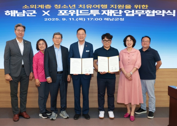 “모든 청소년들에게 여행을”해남군-포위드투 재단 맞손 [PEDIEN] 해남군과 포위드투 재단은 지난 11일 소외계층 청소년들의 문화향유권 증진을 위한 ‘포위드투 여행 프로젝트 업무협약’을 체결했다. 이번 협약을 통해 양 기관은 지역 내 소외계층 청소년들이 다양한 문화를 체험할 수 있도록 협력하기로 뜻을 모았다. 첫 활동으로 12일부터 4일간 해남군 관내 소외계층 청소년 11명의 제주도 여행으로 시작되며 소요경비는 전액 재단에서 후원한다. 주요 협약 내용으로 해남군은 문화소외계층 지원을 위한 사업대상자 선정과 원활한 사업 추진을 위한 행정적 지원을 하기로 했다. 또한 포위드투 재단은 여행프로젝트 사업 추진을 위한 재정적 지원 및 사회공헌활동을 기획하고 추진하게 된다. 더불어 이번 제주여행을 시작으로 공연·전시관람, 문화예술 체험 등 다양한 방식의 문화 후원과 장기적으로 해외 여행프로젝트로 확대해 나갈 예정이다. 명현관 해남군수는“모든 청소년이 차별 없이 문화와 여행을 누릴 수 있도록 기회를 마련하는 것은 매우 뜻깊은 일”이라며“이번 협약이 청소년들의 꿈과 자존감을 키우는 계기가 되길 바란다”고 말했다. 이상진 포위드투 재단 대표는“여행을 비롯해 다양한 문화 체험을 지원함으로써 청소년들의 시야를 넓히고 건강한 성장을 도울 것”이라며“앞으로도 해남군과 함께 지속적인 후원 활동을 이어가겠다”고 밝혔다. 한편 포위드투 재단은 미국 캘리포니아에 본사를 두고 2008년부터 자선단체 활동을 시작해 보육원 건립 등 폭넓은 사회공헌활동을 전개하고 있다. 지난해에는 공익 재단으로 전환, 탈북배경 청소년 여행, 다문화 어머니 농구단 ‘글로벌 마더스’ 창단, 남양주시 소외계층 청소년 여행, 다문화가정 베트남 여행 등 소외계층의 문화지원 사업에 집중해 활동하고 있다. -