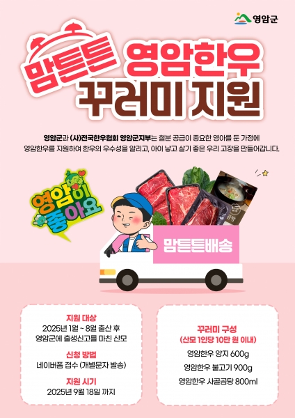 영암한우가 영암 산모의 건강을 지킨다 [PEDIEN] 영암군과 전국한우협회 영암군지부가, 영유아 산모의 건강을 위해 진행하는 ‘맘튼튼 영암한우 꾸러미 지원사업’ 참여자를 이달 18일까지 접수받는다. 이 지원사업은 지역 소멸 위기 극복과 출산 장려를 위한 것으로 올해 1~8월 출산한 영암 산모 120명에게 1인당 10만원 상당의 영암한우 꾸러미를 제공하는 내용이다. 꾸러미는 영암한우 양지 600g, 불고기 900g, 사골곰탕 800ml로 산모와 아이의 건강을 위한 맞춤형 상품들로 구성돼 있다. 신청은 영암군이 발송한 휴대폰 문자를 참조해 산모가 개별 신청하면 된다. 이승준 영암군 농축산유통과장은 “아이 키우기 좋은 도시 영암과 영암한우의 우수성을 동시에 알릴 수 있는 사업에 산모들의 많은 신청바란다. 맘튼튼 영암한우 꾸러미 사업이 매년 이어질 수 있도록 제도로 정착해 나가는 방안도 강구하겠다”고 전했다. -