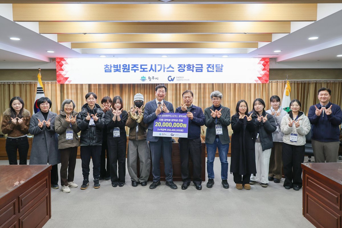 참빛원주도시가스, 원주 출신 대학생에 장학금 전달 (원주시 제공) [PEDIEN] 참빛원주도시가스가 지난달 28일 원주시청에서 지역 대학생 10명에게 총 2천만 원의 장학금을 전달하며 따뜻한 나눔을 실천했다.참빛원주도시가스는 2008년부터 원주시의 추천을 받아 성적 우수 학생들에게 장학금을 지원, 지역 사회의 인재 육성에 꾸준히 기여해 왔다.지금까지 지원한 장학금은 총 2억 5천만 원에 달한다.김문택 참빛원주도시가스 대표이사는 앞으로도 장학금 규모를 확대하고 안정적인 도시가스 공급을 통해 원주시 발전에 더욱 힘쓸 것을 약속했다.원강수 원주시장은 참빛원주도시가스에 감사를 표하며, 장학금을 받은 학생들이 지역 발전에 기여하는 인재로 성장하기를 기대한다고 밝혔다.이번 장학금 전달은 지역 사회와 기업이 협력하여 미래 인재를 육성하는 모범 사례로 평가받고 있다. -