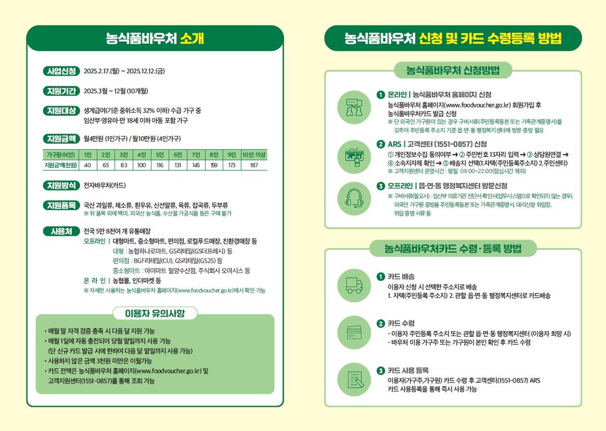 2025년도 농식품 바우처 지원 신청 연중 접수 (홍천군 제공) [PEDIEN] 홍천군이 취약계층의 건강한 식생활을 돕기 위해 2025년 농식품 바우처 지원 사업 신청을 연중 접수한다.이번 사업은 경제적 어려움을 겪는 주민들이 신선한 농산물을 쉽게 구매할 수 있도록 바우처를 지원하는 제도다.지원 대상은 임산부, 영유아, 18세 이하 아동을 포함한 생계급여 수급 가구다. 선정된 가구에는 가구원 수에 따라 차등 지급되며, 4인 가구 기준으로 월 10만 원 상당의 바우처가 제공된다. -