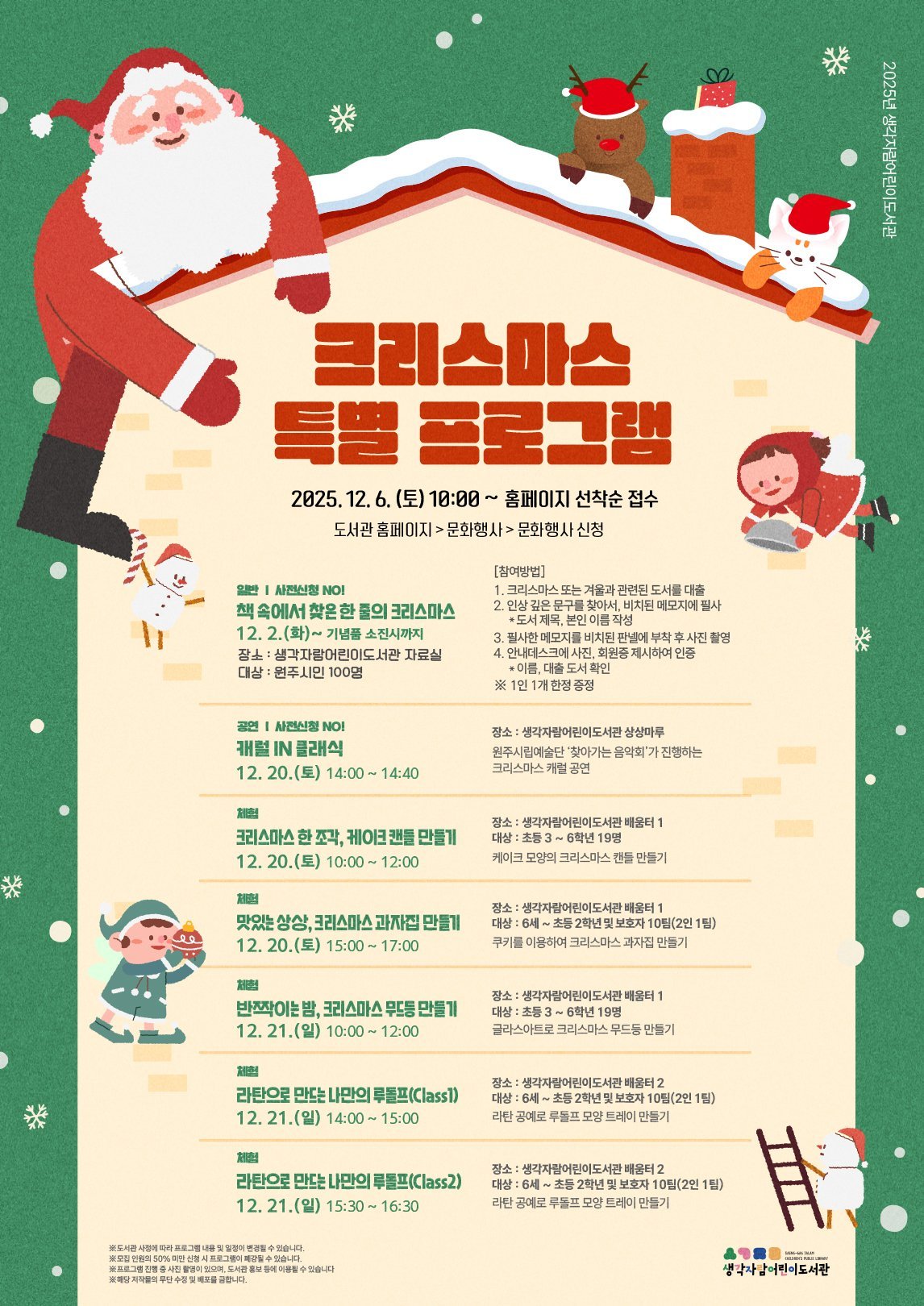 생각자람어린이도서관, 2025년 크리스마스 특별 프로그램 운영 (원주시 제공) [PEDIEN] 원주시 생각자람어린이도서관이 12월 2일부터 21일까지 어린이와 가족을 위한 크리스마스 특별 프로그램을 운영한다.이번 프로그램은 책을 통해 크리스마스 분위기를 느끼고, 직접 만들기에 참여하며, 음악 공연을 즐기는 다채로운 행사로 구성되어 시민들에게 따뜻한 연말 분위기를 선사할 예정이다.주요 프로그램으로는 '책 속에서 찾은 한 줄의 크리스마스'가 있다. 이는 도서관 이용자가 대출한 책 속에서 겨울 또는 크리스마스와 관련된 문구를 찾아 필사 후 인증하면 기념품을 받을 수 있는 행사다.또한 원주시립예술단의 찾아가는 음악회와 함께하는 캐럴 공연 '캐럴 IN 클래식'도 진행되어 크리스마스 분위기를 한층 고조시킬 것으로 보인다.이 외에도 '크리스마스 한 조각, 케이크 캔들 만들기', '맛있는 상상, 크리스마스 과자집 만들기', '반짝이는 밤, 크리스마스 무드등 만들기', '라탄으로 만드는 나만의 루돌프 Class1, Class2' 등 다양한 체험 프로그램이 준비되어 있다.참여 신청은 12월 6일 오전 10시부터 도서관 누리집에서 선착순으로 접수한다.도서관 관계자는 이번 프로그램을 통해 어린이들이 책과 더욱 가까워지고, 시민들이 따뜻한 연말 정서를 느끼는 소중한 시간이 되기를 바란다고 밝혔다. -