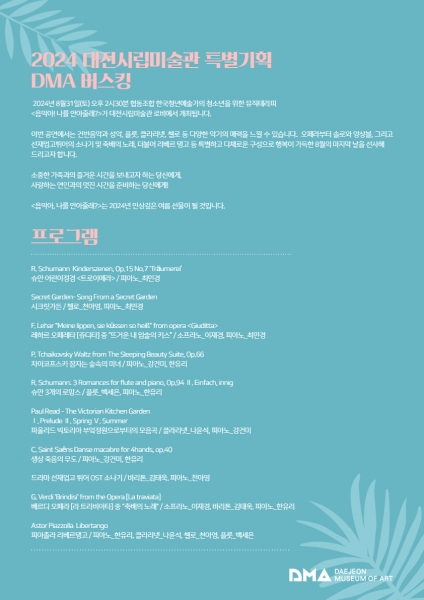 [PEDIEN] 대전시립미술관은 2024 특별기획 DMA 버스킹 첫 공연으로 8월 31일 오후 2시 30분부터 대전시립미술관 로비에서 청소년을 위한 뮤직테라피 ‘음악아 나를 안아줄래?’를 개최한다.