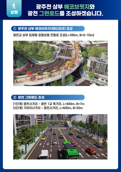 광천권역 교통대책 핵심내용을 보면 △도시철도 상무광천선과 BRT 개통 △도심급행버스와 구도심 연결 상생버스 신설 △광주천 상부 에코브릿지와 광천그린로드 조성 △막힌 곳은 뚫고 끊어진 곳은 연결하는 도로정비 등이다.