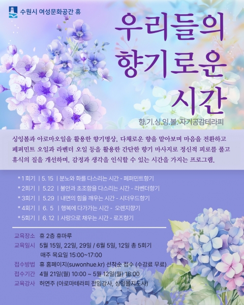 수원시 여성문화공간-휴 관계자는 “향기와 소리를 활용해 스트레스를 완화하고 심신 이완을 할 수 있는 프로그램”이라며 “온전한 쉼의 시간을 제공하는 프로그램에 많은 여성이 참여하길 바란다”고 말했다.