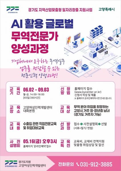[PEDIEN] 고양특례시는 2025년 지역·산업 맞춤형 일자리창출 지원사업에 선정된 ‘AI활용 글로벌 무역전문가 양성과정’ 교육생을 5월 18일까지 모집한다고 밝혔다.