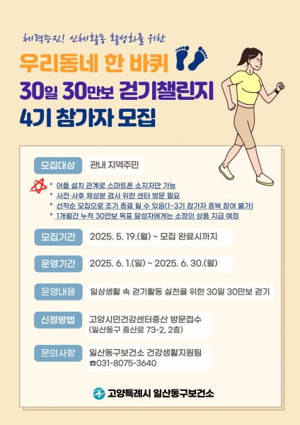 [PEDIEN] 고양특례시 일산동구보건소는 지역주민의 체력증진과 신체활동 활성화를 위한 ‘2025년 우리동네 한 바퀴 30일 30만보 걷기챌린지’4기 참가자를 오는 19일부터 모집한다.