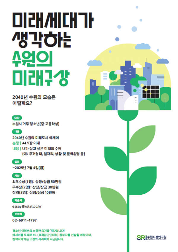 이번 공모전은 수원의 중장기 도시 발전방향을 미래세대의 눈높이에서 살펴보는 시민참여형 정책연구의 일환이다.