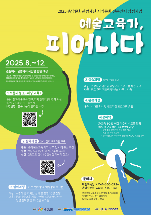 충남문화관광재단 관계자는 “충남 전역의 문화예술교육을 설계하고 실행할 수 있는 사람을 키우는 여정이자, 도민의 문화적 삶의 질을 높이기 위한 실천적 시작”이라며 “새로운 예술교육가들이 지역 현장에 신선한 활기를 불어넣기를 기대한다”고 전했다.