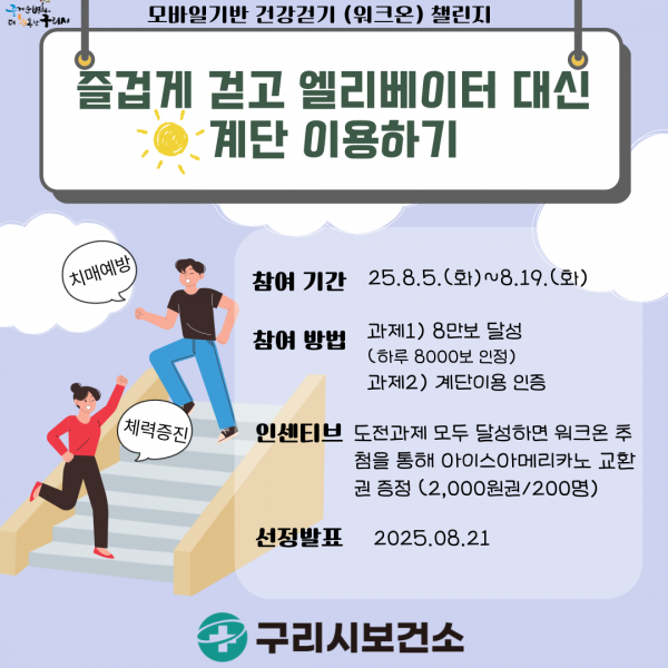 [PEDIEN] 구리시는 8월 5일부터 19일까지 모바일 기반 걷기 앱인 ‘워크온’을 활용한 ‘즐겁게 걷고 엘리베이터 대신 계단 이용하기’ 걷기 챌린지를 운영한다.