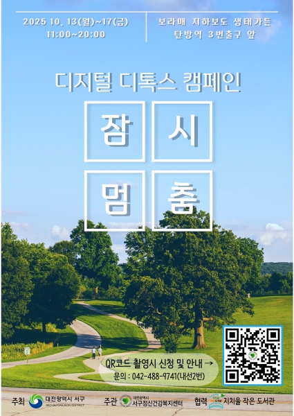 [PEDIEN] 대전 서구 정신건강복지센터는 10월 10일 정신건강의 날을 기념해 다음 달 13일부터 17일까지 보라매 지하보도 생태가든에서 ‘디지털 디톡스 존 잠시 멈춤 캠페인’을 전개한다.