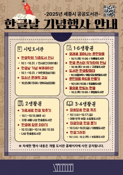 시립도서관에서는 △한글학회 기증도서 전시 △한글날 기념 책추천 △청소년 문해력 교실이 진행된다.