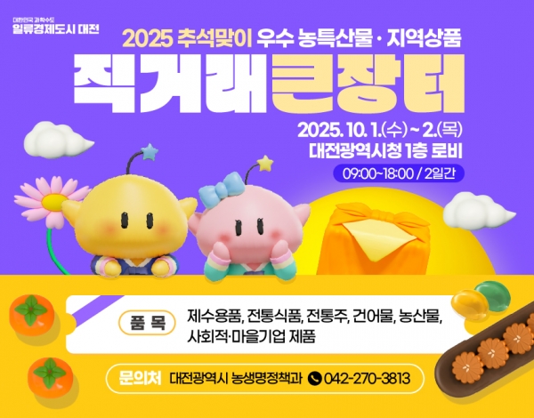 임성복 대전시 농생명정책과장은 “이번 직거래 장터는 시민들에게는 알뜰한 쇼핑 기회를, 농가에는 안정적인 판로를 제공해 모두에게 특별한 추억이 될 것”이라며 “신선하고 품질 좋은 상품으로 시민들이 풍성한 한가위를 보내길 바란다”고 말했다.