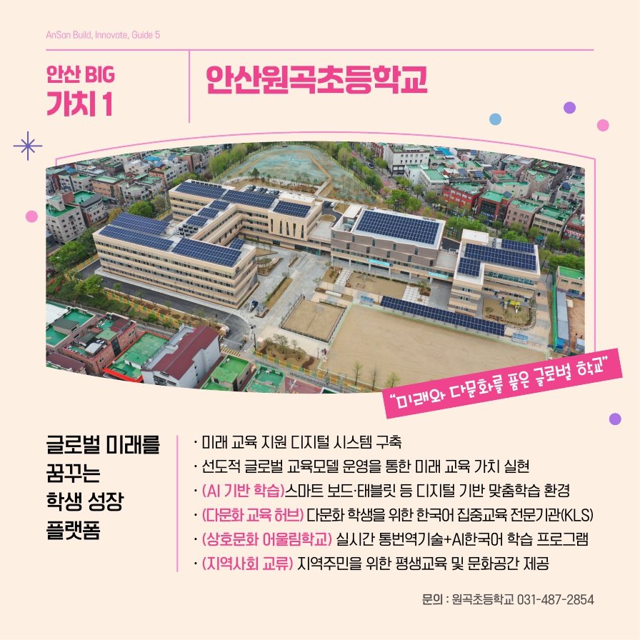 첫 번째 가치인 ‘글로벌 미래 교육 도시’는 다문화 특구 중심에 위치한 원곡초등학교를 통해 실현되고 있다. 원곡초는 언어와 문화의 다양성을 존중하는 맞춤형 교육과 첨단 디지털 시스템을 기반으로 다문화 사회에 대응하는 교육 선도 모델로 자리매김했다. 전국 학교와 교사들의 벤치마킹이 이어지는 등 인재 양성의 중심축으로 주목받고 있다.