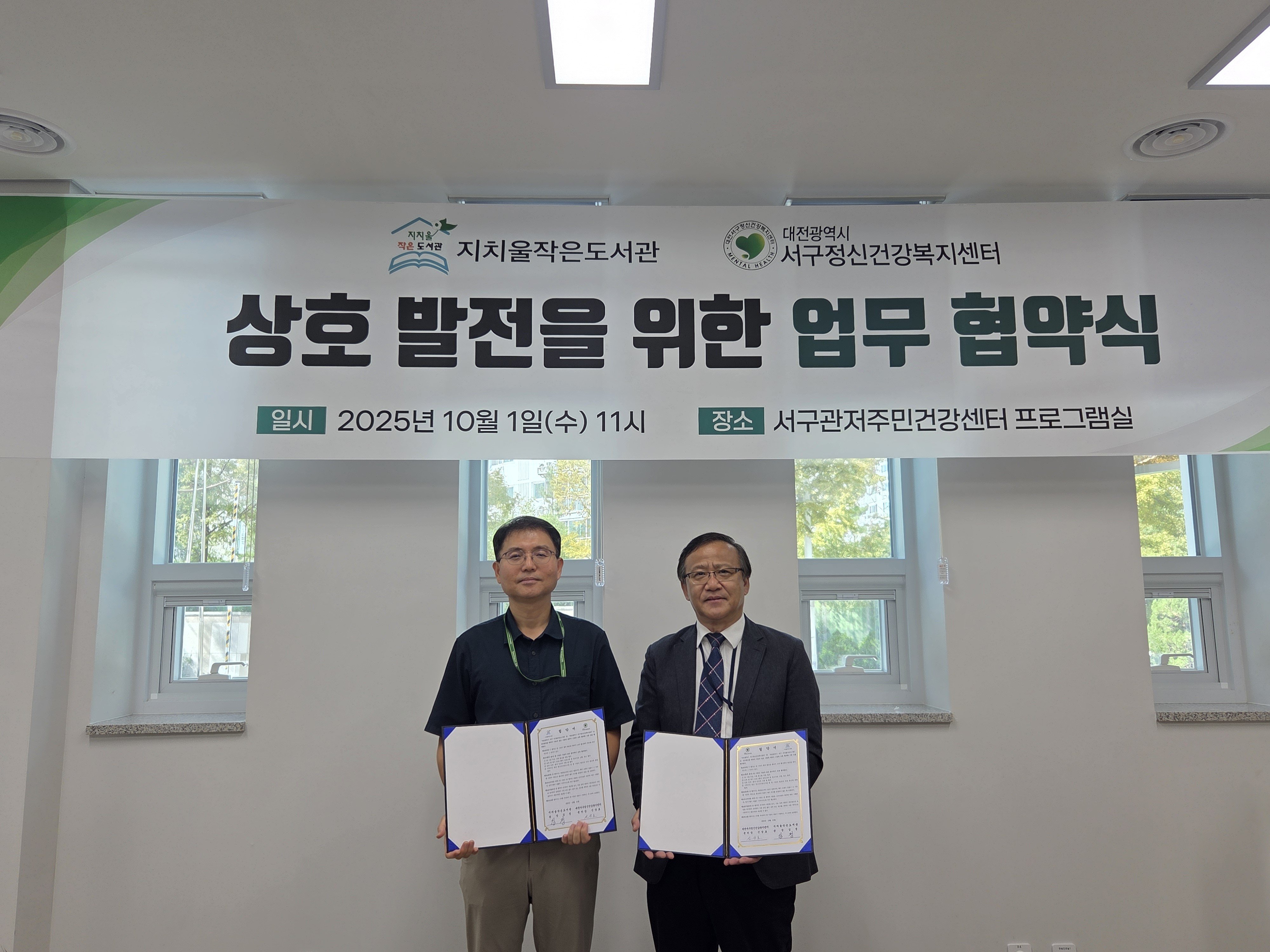 서구 평생학습원 지치울작은도서관은 최근 서구정신건강복지센터와 상호 협력 및 공동 발전을 위한 업무협약(MOU)을 체결하고, 교육, 문화, 복지를 연계한 복합 서비스 제공에 나선다고 20일 밝혔다.