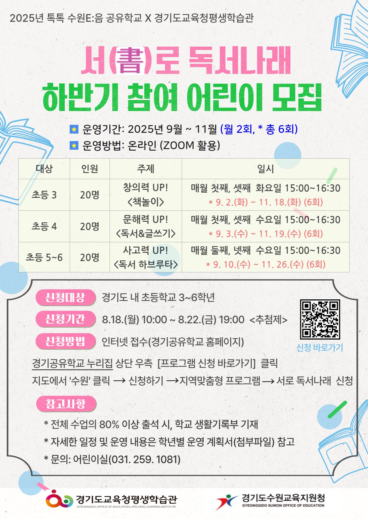 [PEDIEN] 경기도교육청평생학습관이 수원교육지원청과 협력하여 초등학교 3~6학년 학생들의 독서 습관 형성 및 사고력 향상을 위한 온라인 공유학교 ‘서()로 독서나래’를 운영한다. 이 프로그램은 9월부터 11월까지 약 세 달간 진행되며, 학생들이 독서를 통해 공감 능력과 비판적 사고력을 키우는 데 중점을 둔다.
