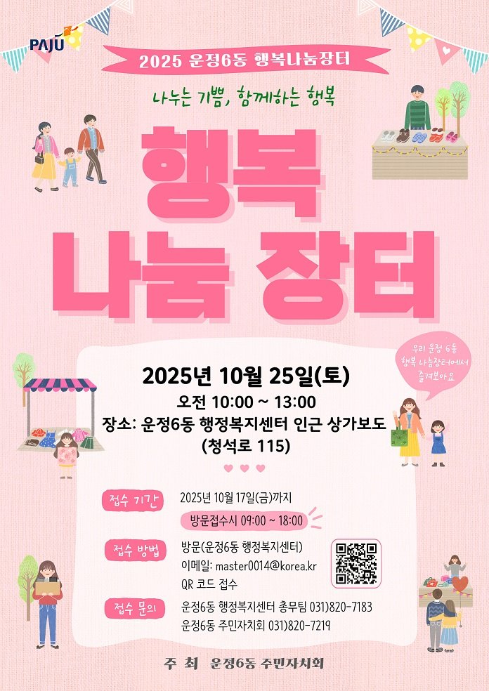 한편, 운정6동 주민자치회는 행사 성공을 위해 나눔장터 판매 참가자와 체험 공간 운영자를 사전 모집하고 있다. 참여를 희망하는 주민은 운정6동 행정복지센터 방문, QR코드, 또는 전자우편을 통해 신청할 수 있다.