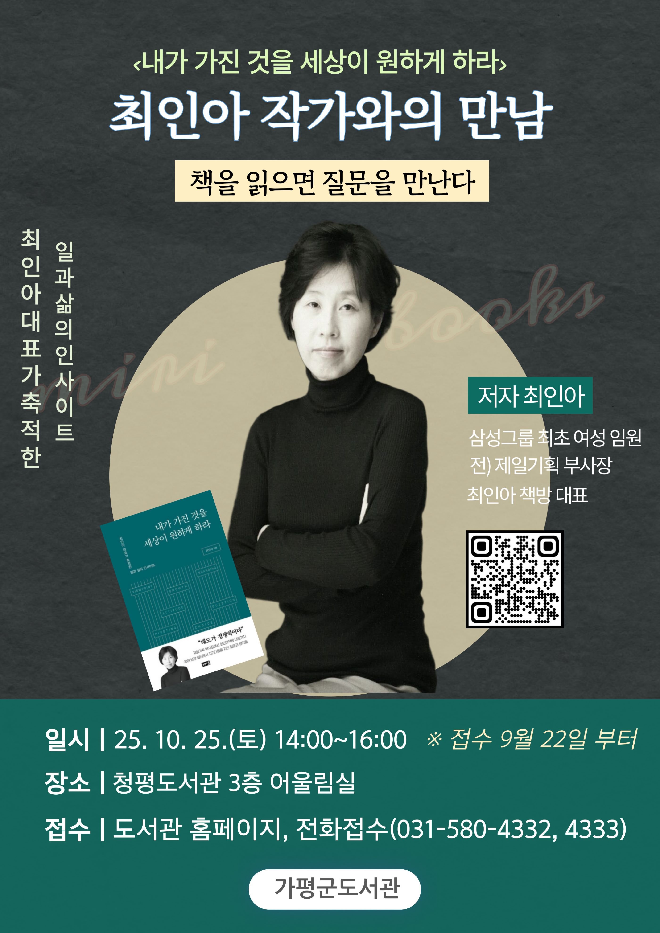 [PEDIEN] 가평군이 광고계의 성공 신화이자 현재는 '책방지기'로 변신한 최인아 작가를 초청해 특별 강연을 개최한다. 군은 오는 25일 오후 2시 청평도서관에서 '2025년 정기 작가와의 만남'을 열고, 최 작가로부터 '책을 읽으면 질문을 만난다'는 주제로 독서의 새로운 의미를 듣는 자리를 마련했다.